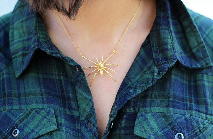 Love the combination of the plaid and the maxi skirt, so cute. And I hate spiders but I have to admit that necklace is pretty sweet!