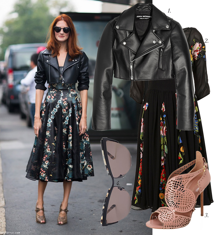 Street style image via Stockholm Street Style // 1.) Junya Watanabe jacket // 2.) Topshop dress // 3.) Sergio Rossi heels // 4.) Prism sunglasses