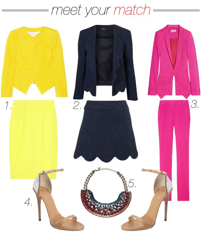 1.) Blazer: Girl by Band of Outsiders; Skirt: Christopher Kane; 2.) Blazer: Topshop; Skirt: Topshop; 3.) Blazer: Preen; Pants: Preen; 4.) Giuseppe Zanotti; 5.) Dannijo