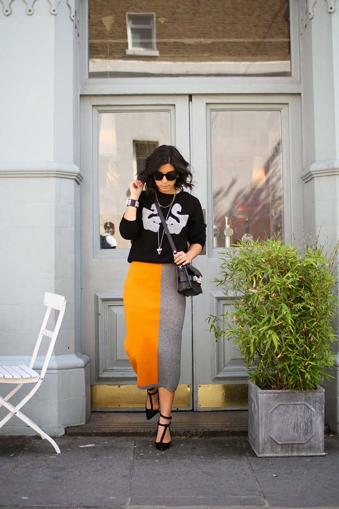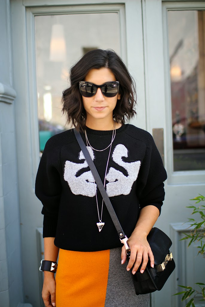 Jumper and skirt: Brooke Roberts; Shoes: Henri Lepore Dezert; Bag: Proenza Schouler; Sunglasses: Elizabeth James; Necklace: Givenchy; Cuff: Hermes