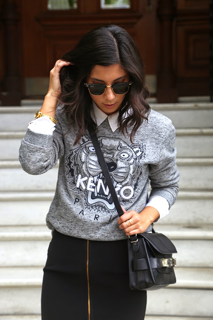 Sweater: Kenzo; Shirt: Equipment; Skirt: Zara (similar style here); Shoes: Saint Laurent (love this pair); Bag: Proenza Schouler; Sunglasses: Ray-Ban; Watch: Movado